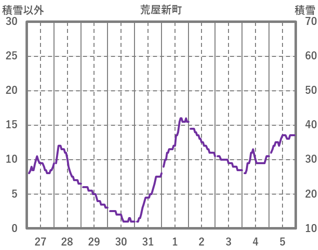 | 日 | 時 | 気温 | 降水 | 風向/風速 | 日照 | 積雪 | 降雪 |