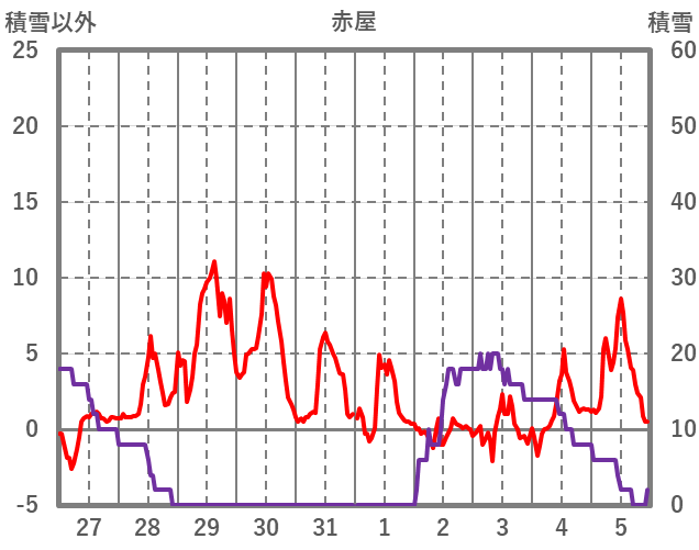 | 日 | 時 | 気温 | 降水 | 風向/風速 | 日照 | 積雪 | 降雪 |