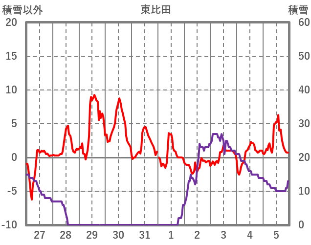 | 日 | 時 | 気温 | 降水 | 風向/風速 | 日照 | 積雪 | 降雪 |