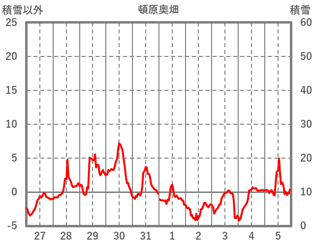| 日 | 時 | 気温 | 降水 | 風向/風速 | 日照 | 積雪 | 降雪 |