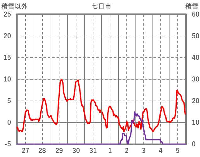 | 日 | 時 | 気温 | 降水 | 風向/風速 | 日照 | 積雪 | 降雪 |