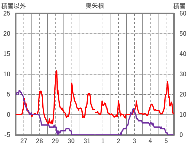 | 日 | 時 | 気温 | 降水 | 風向/風速 | 日照 | 積雪 | 降雪 |