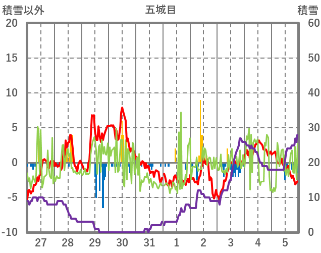 | 日 | 時 | 気温 | 降水 | 風向/風速 | 日照 | 積雪 | 降雪 |