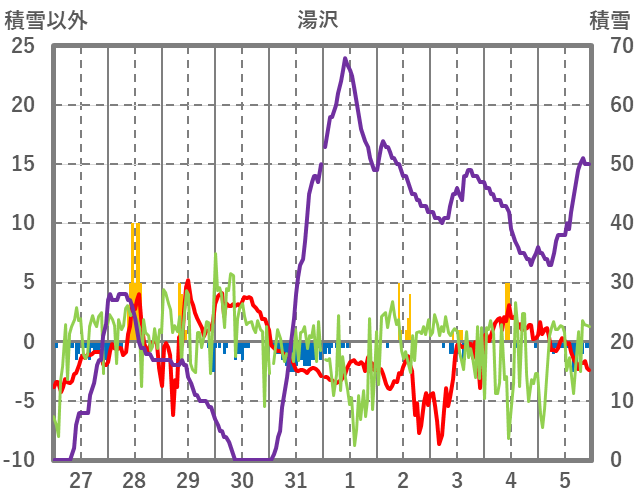| 日 | 時 | 気温 | 降水 | 風向/風速 | 日照 | 積雪 | 降雪 |
