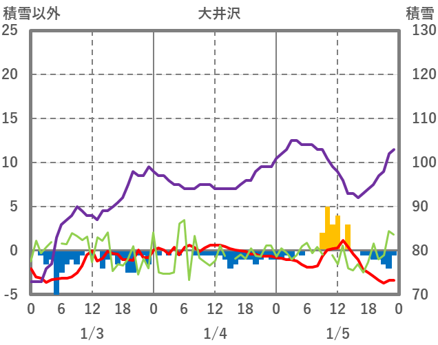 | 日 | 時 | 気温 | 降水 | 風向/風速 | 日照 | 積雪 | 降雪 |