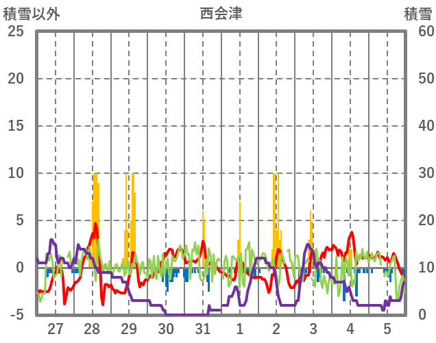 | 日 | 時 | 気温 | 降水 | 風向/風速 | 日照 | 積雪 | 降雪 |