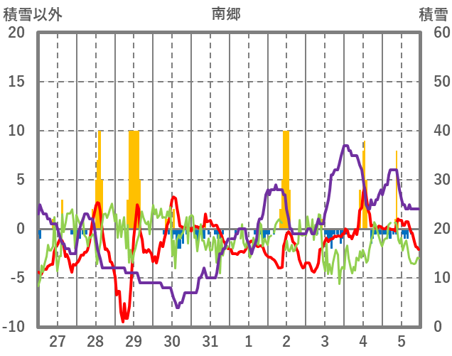 | 日 | 時 | 気温 | 降水 | 風向/風速 | 日照 | 積雪 | 降雪 |