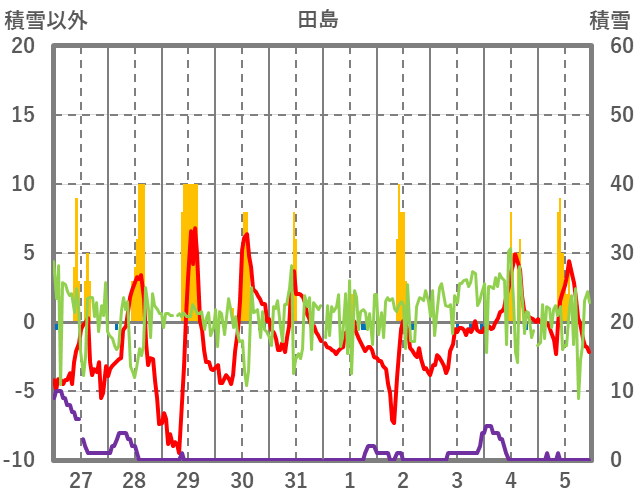 | 日 | 時 | 気温 | 降水 | 風向/風速 | 日照 | 積雪 | 降雪 |