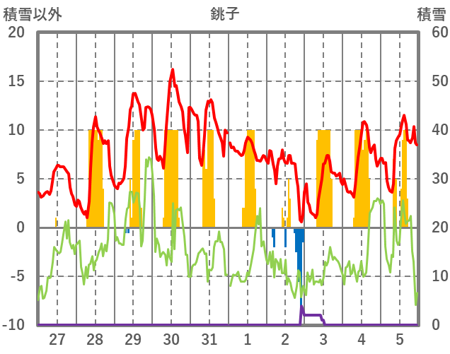 | 日 | 時 | 気温 | 降水 | 風向/風速 | 日照 | 積雪 | 降雪 |