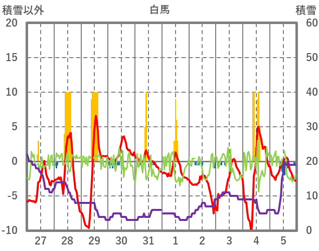 | 日 | 時 | 気温 | 降水 | 風向/風速 | 日照 | 積雪 | 降雪 |