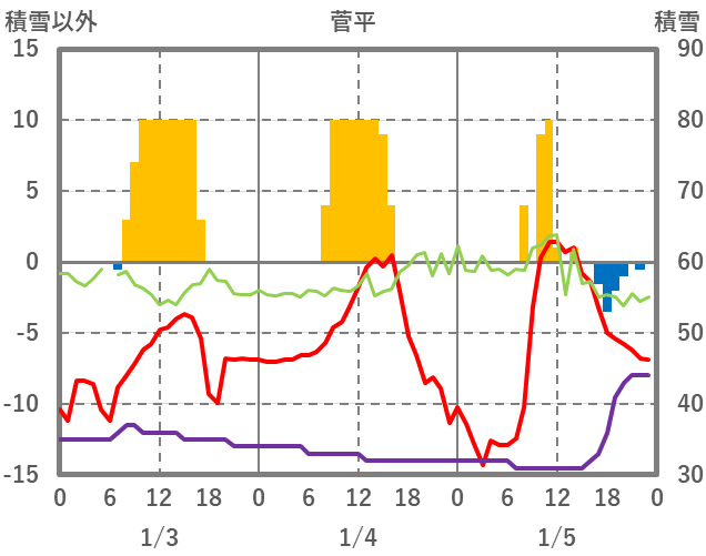 | 日 | 時 | 気温 | 降水 | 風向/風速 | 日照 | 積雪 | 降雪 |