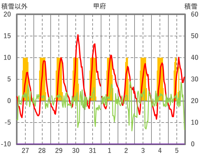 | 日 | 時 | 気温 | 降水 | 風向/風速 | 日照 | 積雪 | 降雪 |