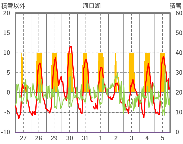 | 日 | 時 | 気温 | 降水 | 風向/風速 | 日照 | 積雪 | 降雪 |