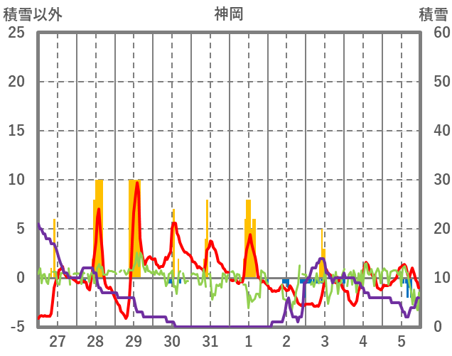 | 日 | 時 | 気温 | 降水 | 風向/風速 | 日照 | 積雪 | 降雪 |
