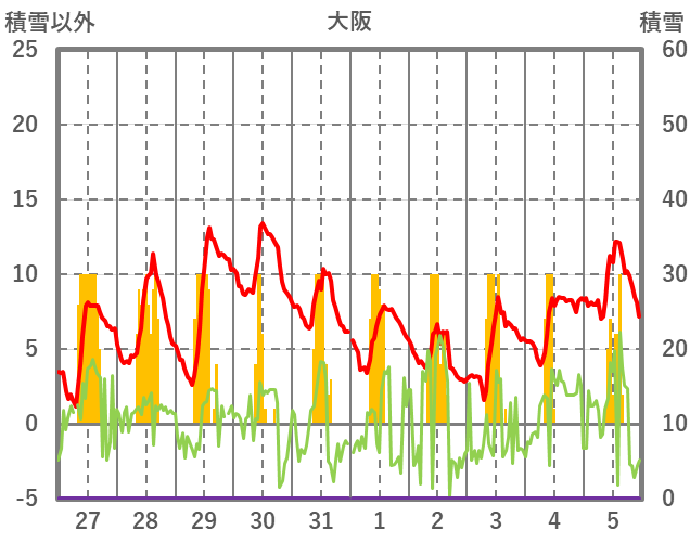 | 日 | 時 | 気温 | 降水 | 風向/風速 | 日照 | 積雪 | 降雪 |
