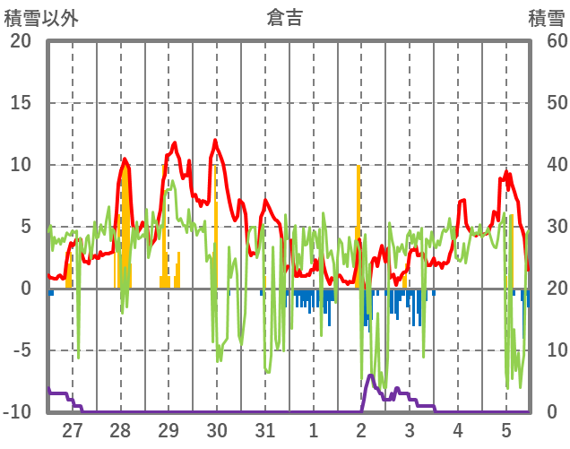 | 日 | 時 | 気温 | 降水 | 風向/風速 | 日照 | 積雪 | 降雪 |