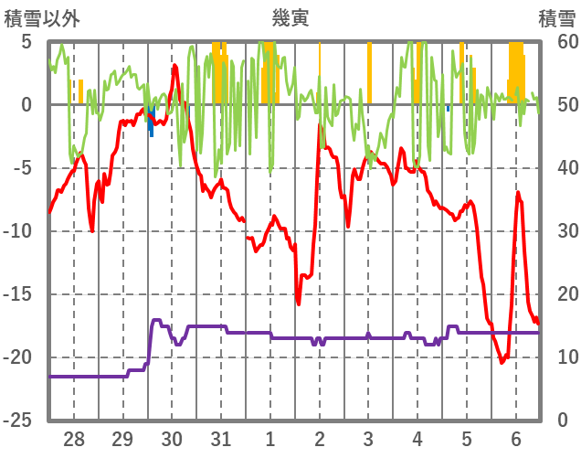 | 日 | 時 | 気温 | 降水 | 風向/風速 | 日照 | 積雪 | 降雪 |