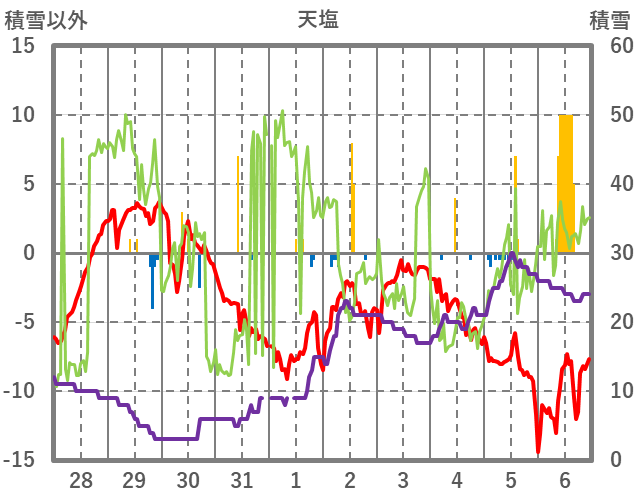 | 日 | 時 | 気温 | 降水 | 風向/風速 | 日照 | 積雪 | 降雪 |