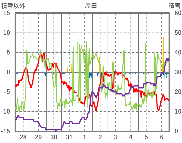 | 日 | 時 | 気温 | 降水 | 風向/風速 | 日照 | 積雪 | 降雪 |