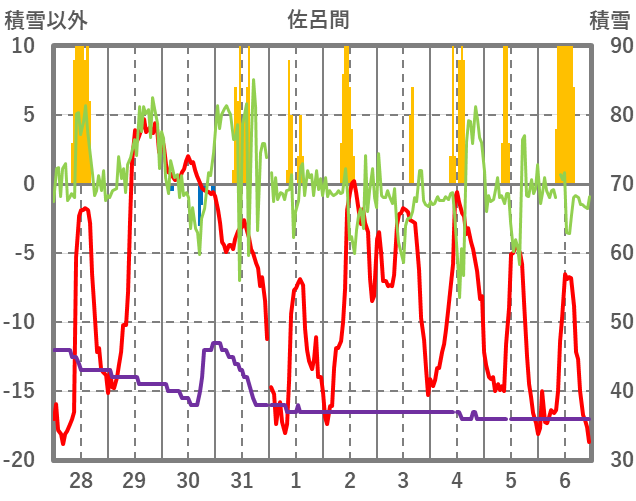 | 日 | 時 | 気温 | 降水 | 風向/風速 | 日照 | 積雪 | 降雪 |