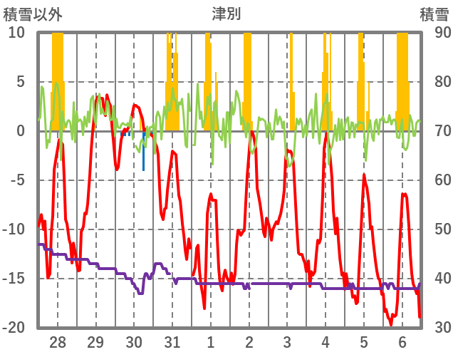 | 日 | 時 | 気温 | 降水 | 風向/風速 | 日照 | 積雪 | 降雪 |