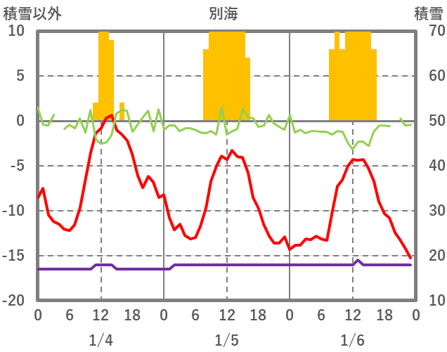 | 日 | 時 | 気温 | 降水 | 風向/風速 | 日照 | 積雪 | 降雪 |