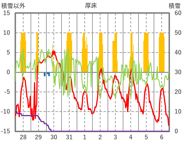 | 日 | 時 | 気温 | 降水 | 風向/風速 | 日照 | 積雪 | 降雪 |