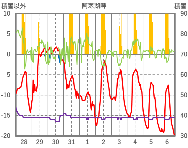 | 日 | 時 | 気温 | 降水 | 風向/風速 | 日照 | 積雪 | 降雪 |