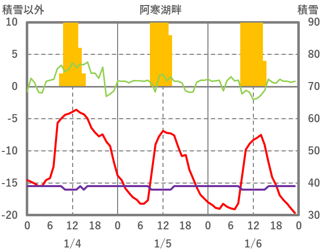 | 日 | 時 | 気温 | 降水 | 風向/風速 | 日照 | 積雪 | 降雪 |
