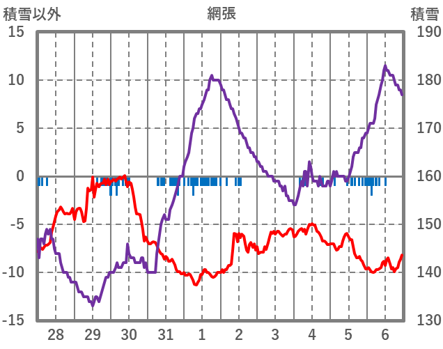 | 日 | 時 | 気温 | 降水 | 風向/風速 | 日照 | 積雪 | 降雪 |