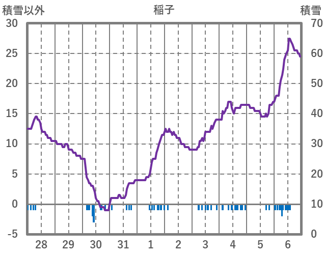 | 日 | 時 | 気温 | 降水 | 風向/風速 | 日照 | 積雪 | 降雪 |