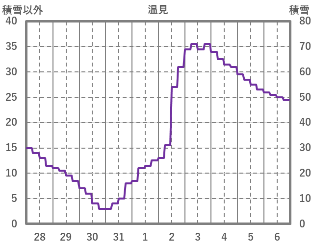 | 日 | 時 | 気温 | 降水 | 風向/風速 | 日照 | 積雪 | 降雪 |