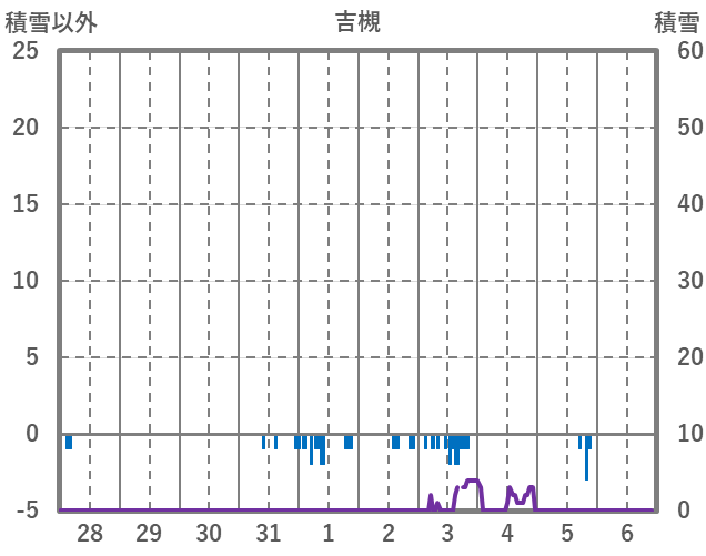 | 日 | 時 | 気温 | 降水 | 風向/風速 | 日照 | 積雪 | 降雪 |