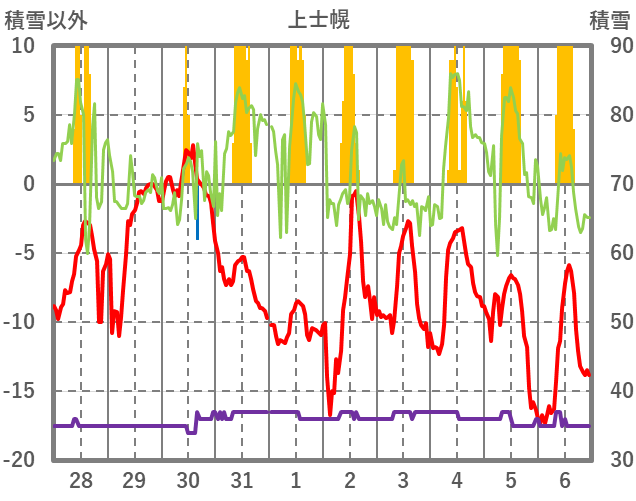 | 日 | 時 | 気温 | 降水 | 風向/風速 | 日照 | 積雪 | 降雪 |