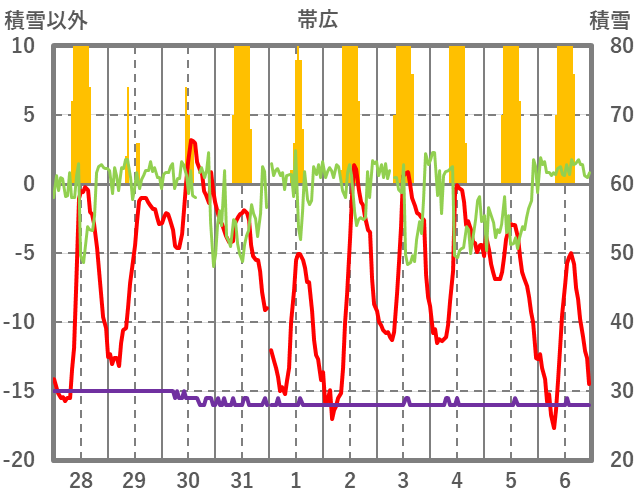 | 日 | 時 | 気温 | 降水 | 風向/風速 | 日照 | 積雪 | 降雪 |