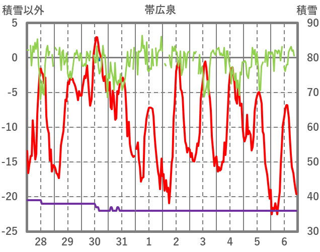 | 日 | 時 | 気温 | 降水 | 風向/風速 | 日照 | 積雪 | 降雪 |