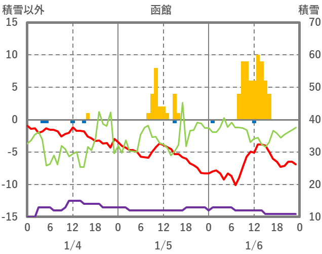 | 日 | 時 | 気温 | 降水 | 風向/風速 | 日照 | 積雪 | 降雪 |