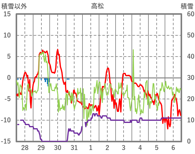 | 日 | 時 | 気温 | 降水 | 風向/風速 | 日照 | 積雪 | 降雪 |