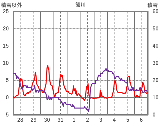 | 日 | 時 | 気温 | 降水 | 風向/風速 | 日照 | 積雪 | 降雪 |