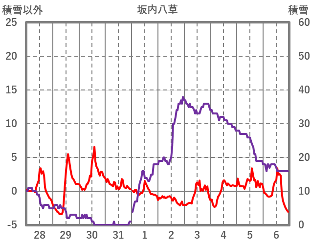 | 日 | 時 | 気温 | 降水 | 風向/風速 | 日照 | 積雪 | 降雪 |