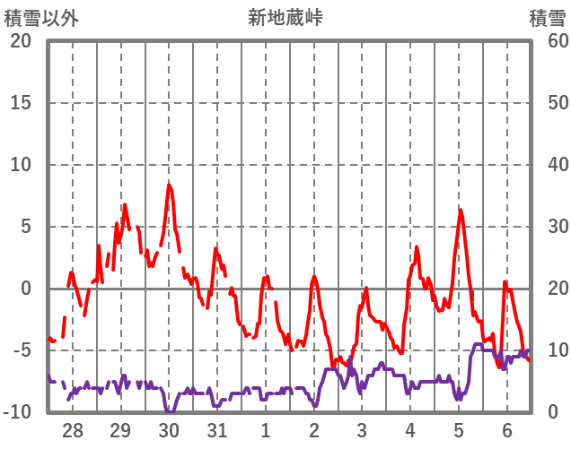 | 日 | 時 | 気温 | 降水 | 風向/風速 | 日照 | 積雪 | 降雪 |