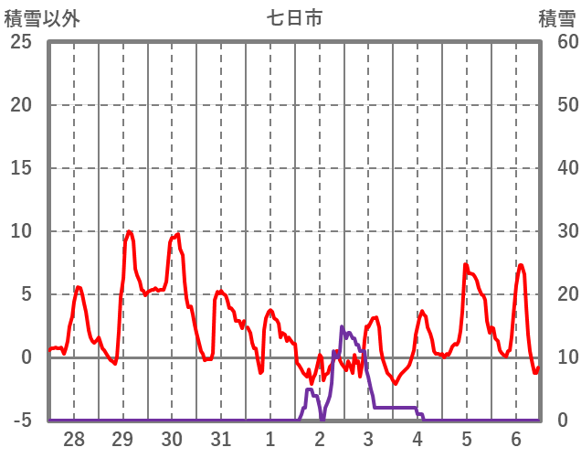| 日 | 時 | 気温 | 降水 | 風向/風速 | 日照 | 積雪 | 降雪 |