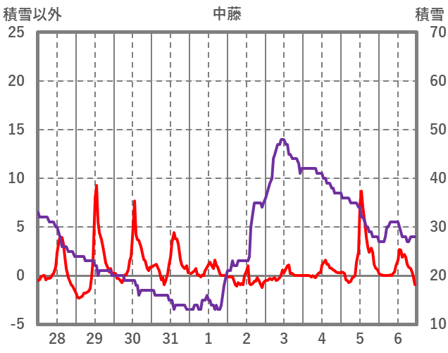 | 日 | 時 | 気温 | 降水 | 風向/風速 | 日照 | 積雪 | 降雪 |