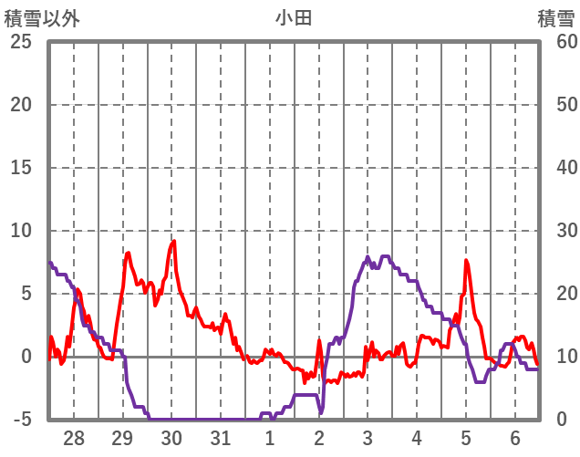 | 日 | 時 | 気温 | 降水 | 風向/風速 | 日照 | 積雪 | 降雪 |