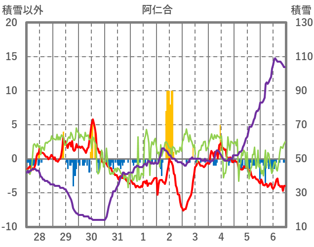 | 日 | 時 | 気温 | 降水 | 風向/風速 | 日照 | 積雪 | 降雪 |
