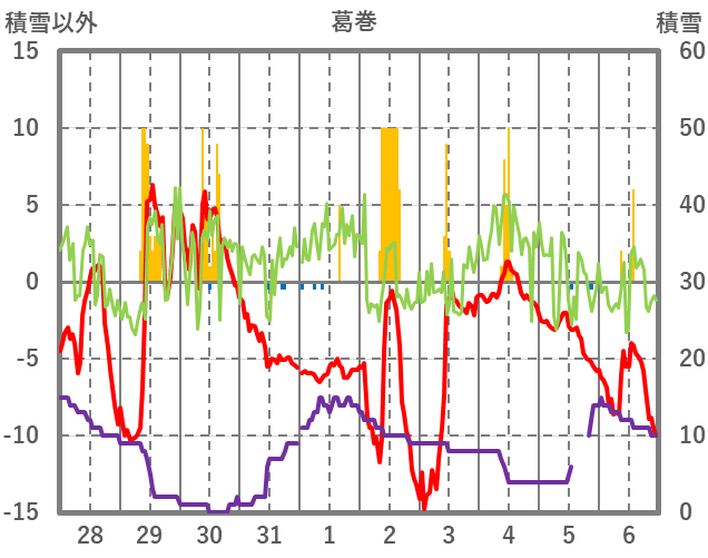 | 日 | 時 | 気温 | 降水 | 風向/風速 | 日照 | 積雪 | 降雪 |