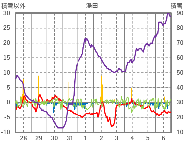 | 日 | 時 | 気温 | 降水 | 風向/風速 | 日照 | 積雪 | 降雪 |