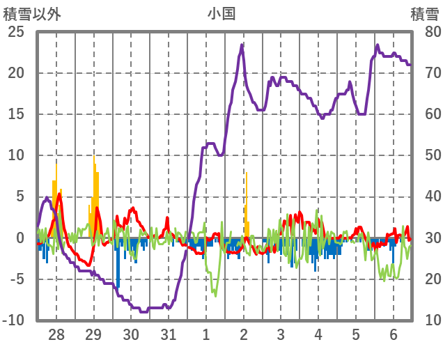 | 日 | 時 | 気温 | 降水 | 風向/風速 | 日照 | 積雪 | 降雪 |
