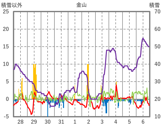 | 日 | 時 | 気温 | 降水 | 風向/風速 | 日照 | 積雪 | 降雪 |