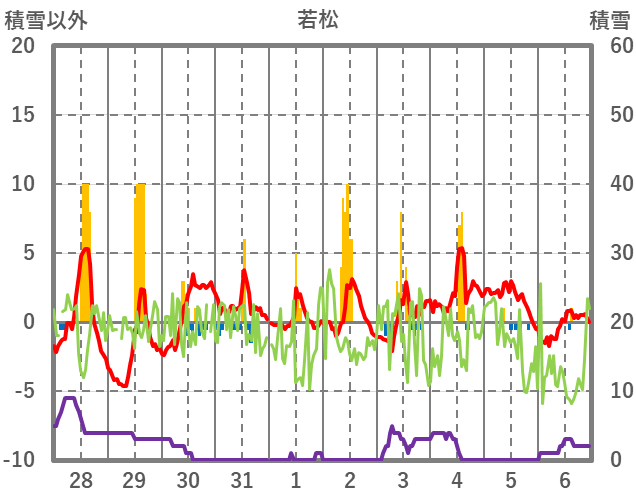 | 日 | 時 | 気温 | 降水 | 風向/風速 | 日照 | 積雪 | 降雪 |